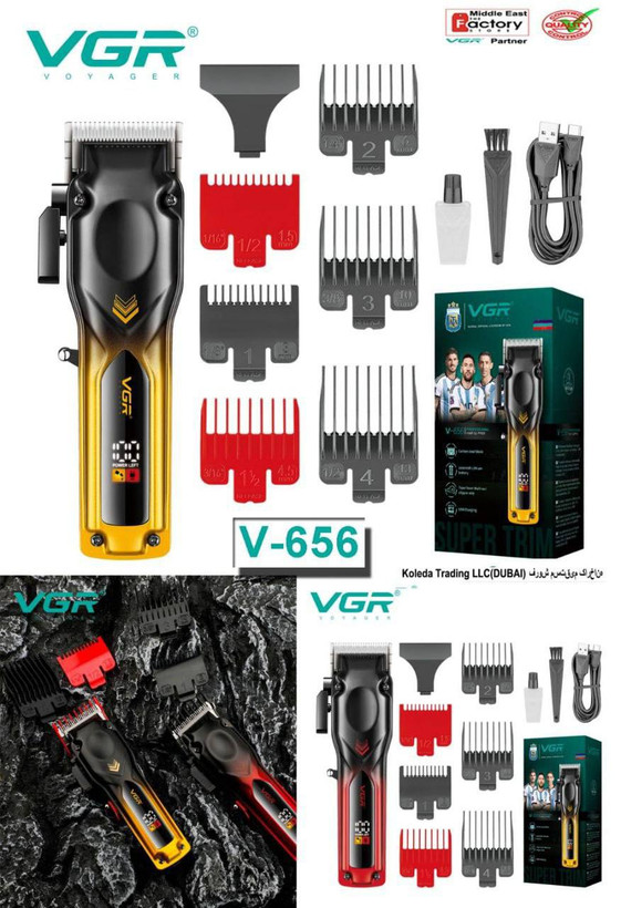 ماشین اصلاح سالنی VGR 656 جنس تیغه استیل ضد زنگ مدت زمان استفاده پس از شارژ ۲۰۰دقیقه باتری۲۰۰۰ میلی آمپر