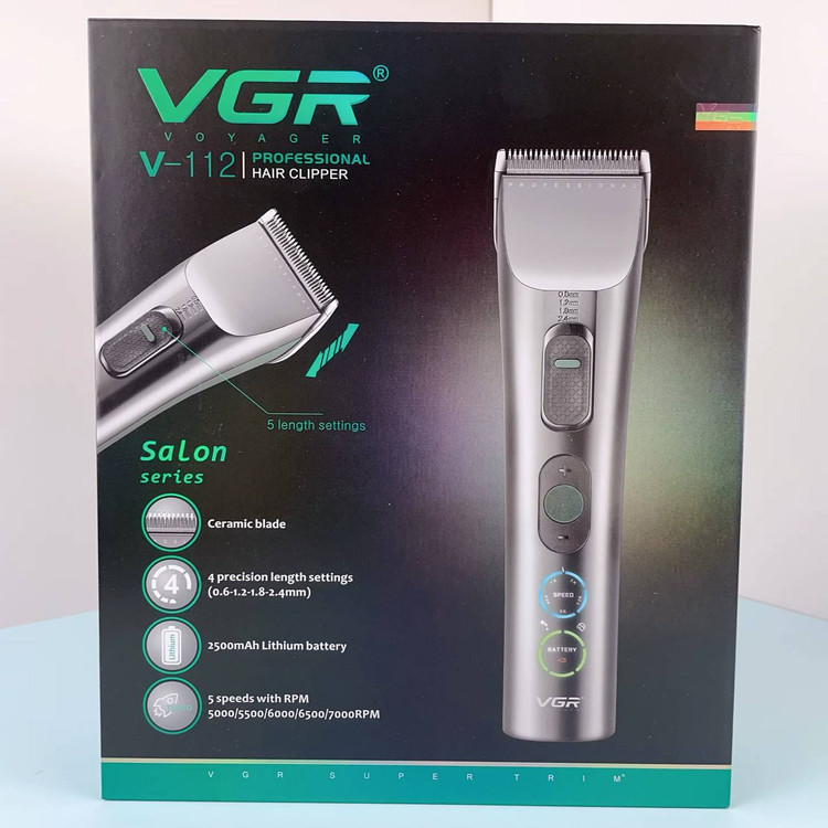ماشین اصلاح فوق حرفه ای VGR 112 دور موتور 7000 قابل تنظیم دارای موتور توربو قابلیت تنظیم سرعت نمایشگر میزان شارژ و سرعت مدت زمان استفاده پس از شارژ ۲۰۰